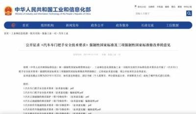 9月24日,工信部官網發布《汽車車門把手安全技術要求(征求意見稿)》(下稱《征求意見稿》),公開征求社會各界對這一強制性國家標準的意見。